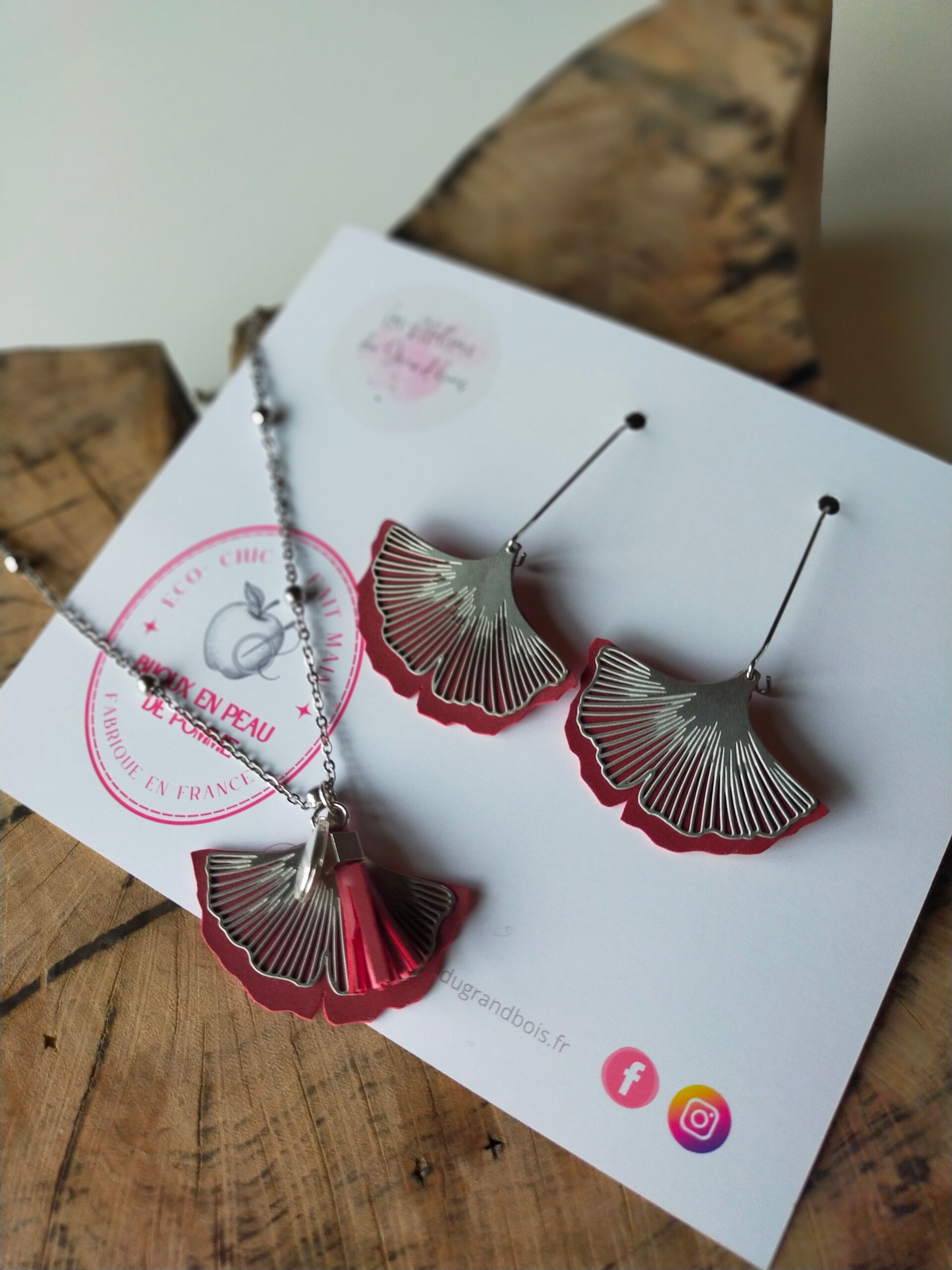 – Feuille Ginkgo en peaux de pomme, avec breloque en laiton ou acier
